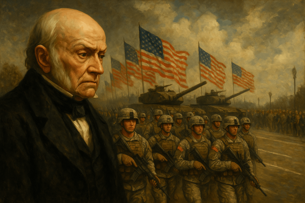 On June 14, 2025, Washington D.C. held a military parade of unprecedented scope. Armored vehicles rolled down Pennsylvania Avenue, jet fighters roared overhead, and battalions in full battle gear marched amid banners. The ostentatious event was less a celebration of the armed forces than a demonstration of centralized power. It rivaled the grandeur of authoritarian states, complete with tanks and troops arrayed in show. John Quincy Adams would have recognized it as the very antithesis of republican simplicity. His American forebears, he believed, had rejected the pomp of European courts; he himself detested excess. The 1825 parade of today’s United States, by contrast, seemed designed to awe the people into submission. Its timing on Flag Day was rich with irony: Adams took his oath on the flag of law, while Trump’s display paraded the flag of force. Where Adams regarded power with skepticism, the modern parade exalts power for its own sake.